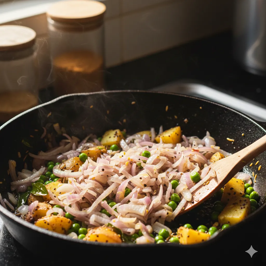 હવે તેમાં સમારેલી ડુંગળી ઉમેરો અને હળવી ગુલાબી થાય ત્યાં સુધી સાંતળો. જો તમે બટાકા અને વટાણા ઉમેરતા હો તો આ સ્ટેજ પર ઉમેરો અને ઢાંકણ ઢાંકી ને થોડા સમય માટે ચડવા દો જેથી બટાકા નરમ થઈ જાય.